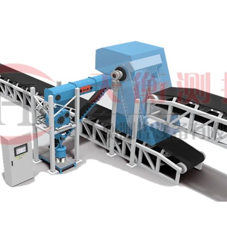 采樣裝置按設(shè)定的時(shí)間從皮帶上做全斷面刮掃,回轉(zhuǎn)運(yùn)動(dòng)式的皮帶頭旋轉(zhuǎn)運(yùn)動(dòng)由PLC控制的減速機(jī)構(gòu)完成。旋轉(zhuǎn)式采樣斗由減速齒輪傳動(dòng),皮帶機(jī)機(jī)頭部滾筒下料的以一定的轉(zhuǎn)速切割料流,物料流在物料流中流過(guò)全寬,全厚完整的子樣。采樣的字樣通過(guò)溜槽進(jìn)入初級(jí)送料皮帶機(jī),同時(shí)把樣品均勻送入破碎機(jī)破碎到一定的粒度,再通過(guò)次級(jí)皮帶及縮分器分成留樣和棄料,留樣被自動(dòng)收集在儲(chǔ)料罐中,棄料被斗式提升機(jī)返回到皮帶。當(dāng)采樣機(jī)器旋轉(zhuǎn)到一定角度時(shí),由轉(zhuǎn)鼓組、料斗、溜槽收集的原始樣品自動(dòng)進(jìn)入樣品收集器或下一級(jí)設(shè)備。采樣頭旋轉(zhuǎn)角度在一個(gè)行程結(jié)束點(diǎn),采樣周期結(jié)束;同時(shí)繼電器啟動(dòng)時(shí)間,直到下一個(gè)采樣周期,再次啟動(dòng)電機(jī),實(shí)時(shí)采樣,從而實(shí)現(xiàn)對(duì)每批物料的采樣數(shù)量控制和采樣的次數(shù)。采樣周期和采樣機(jī)的間隔由PLC系統(tǒng)控制并調(diào)整采樣間隔。